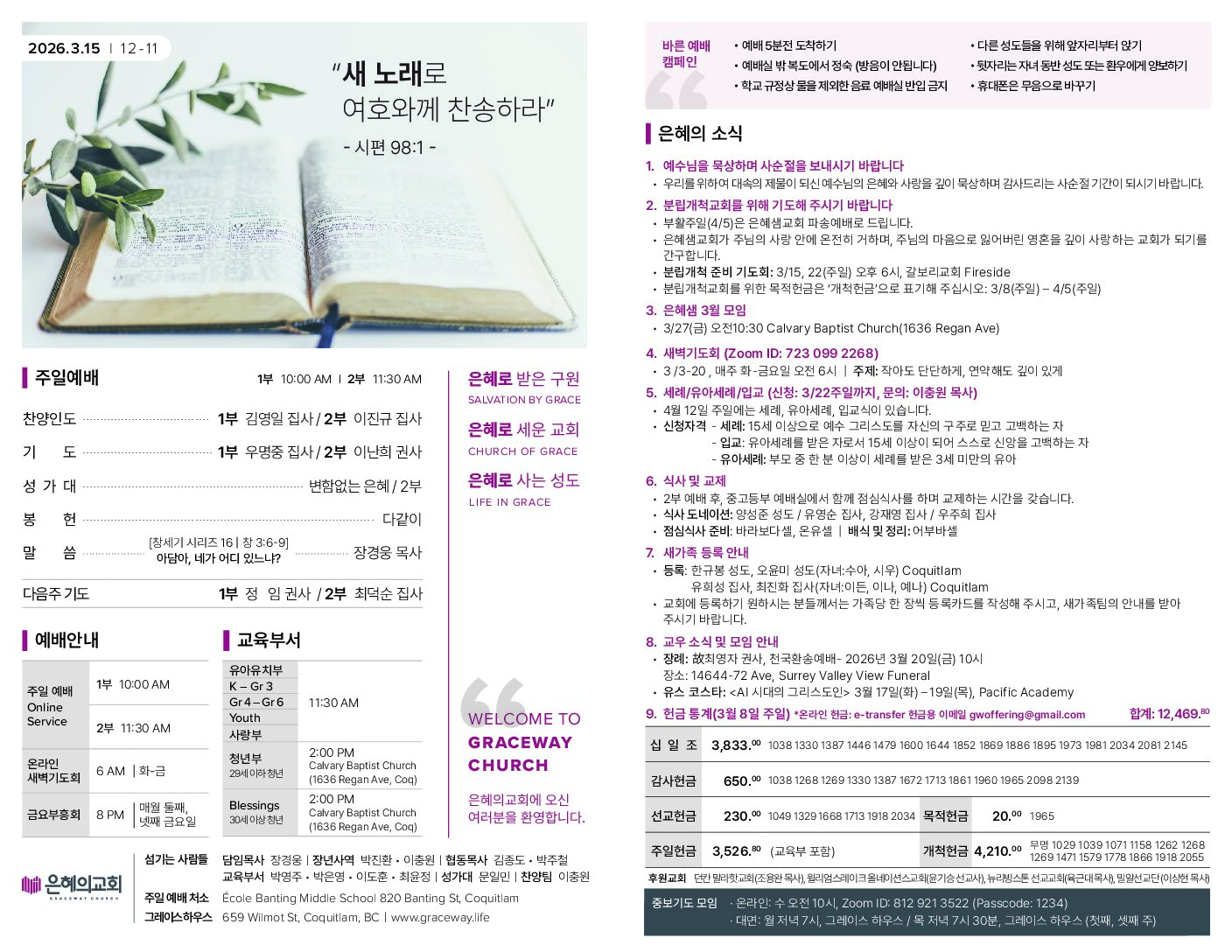 on March 15, 2026자세히1. 예수님을 묵상하며 사순절을 보내시기 바랍니다 • 우리를 위하여 대속의 제물이 되신 예수님의 은혜와 사랑을 깊이 묵상하며 감사드리는 사순절 기간이 되시기 바랍니다. 2. 분립개척교회를 위해...