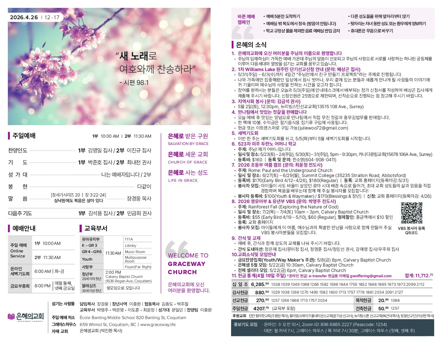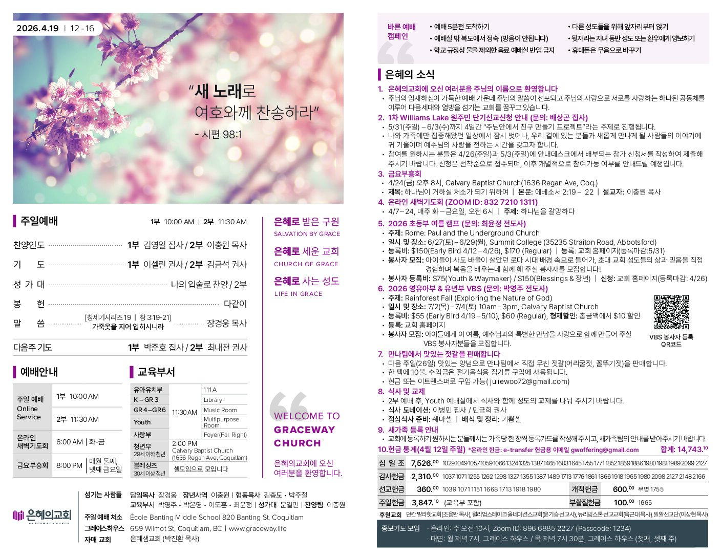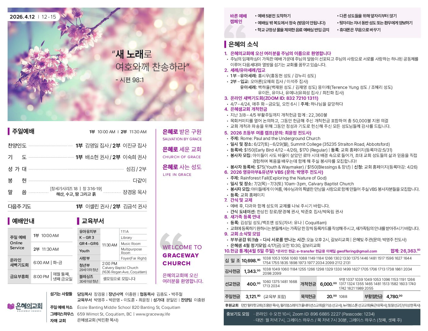 on April 12, 2026자세히1. 은혜의교회에 오신 여러분을 주님의 이름으로 환영합니다 •주님의 임재하심이 가득한 예배 가운데 주님의 말씀이 선포되고 주님의 사랑으로 서로를 사랑하는 하나된 공동체를 이루어 다음세대와 열방을 섬기는...