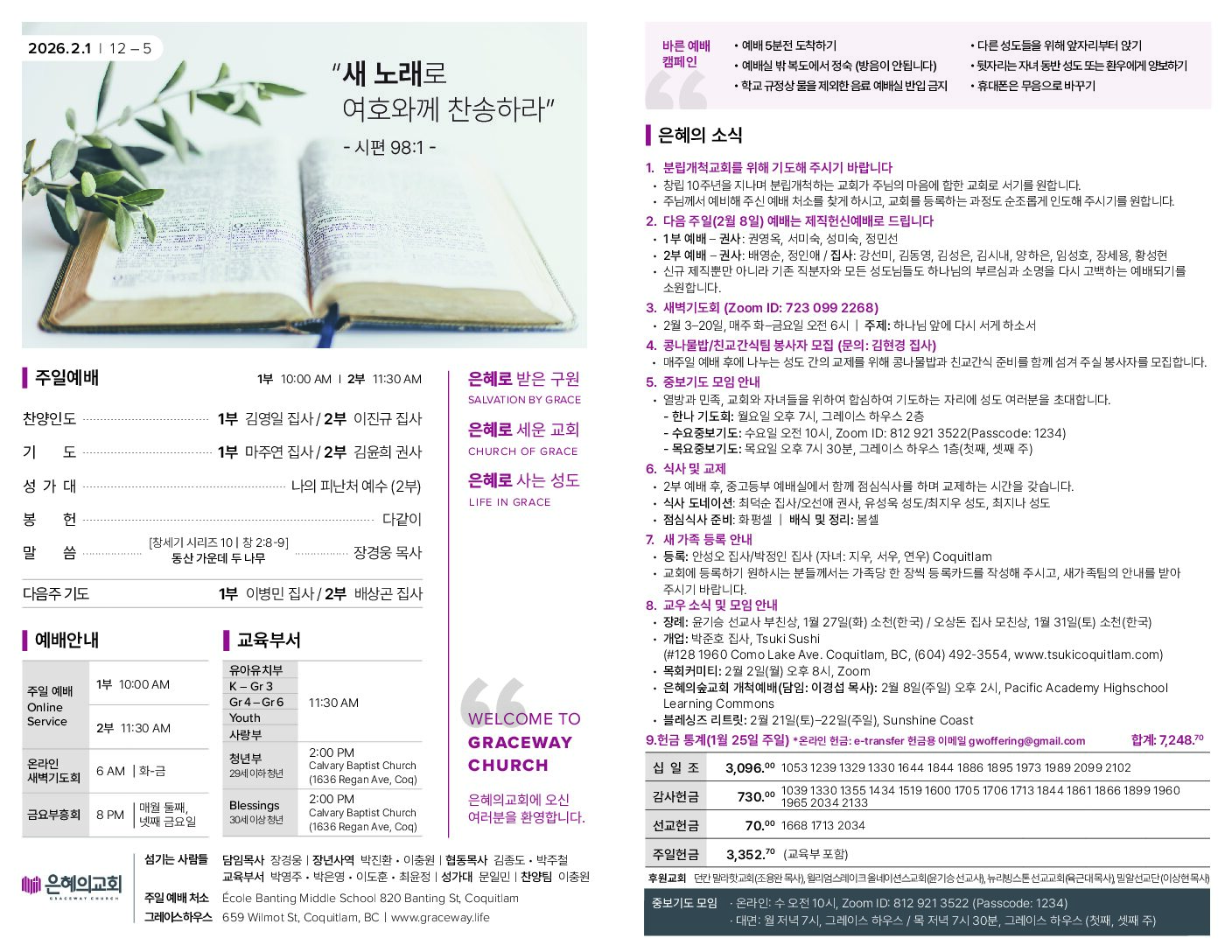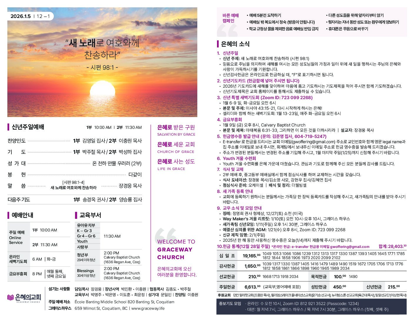 1. 신년주일 신년 주제: 새 노래로 여호와께 찬송하라 (시편 98:1) 믿음으로 주님을 의지하며 새해를 여시는 모든 성도님들의 가정과 일터 위에 새 일을 행하시는 주님의 은혜와 사랑이 가득하시기를 기원합니다. 신년감사헌금은 온라인으로 헌금하실 때, “F”로 표기하시면 됩니다. 2. 신년기도카드 (헌금함에 넣어 주시면 됩니다) 2026년 기도카드에 새해를 맞이하며 마음에 품고 기도하시는 기도제목을 적어...