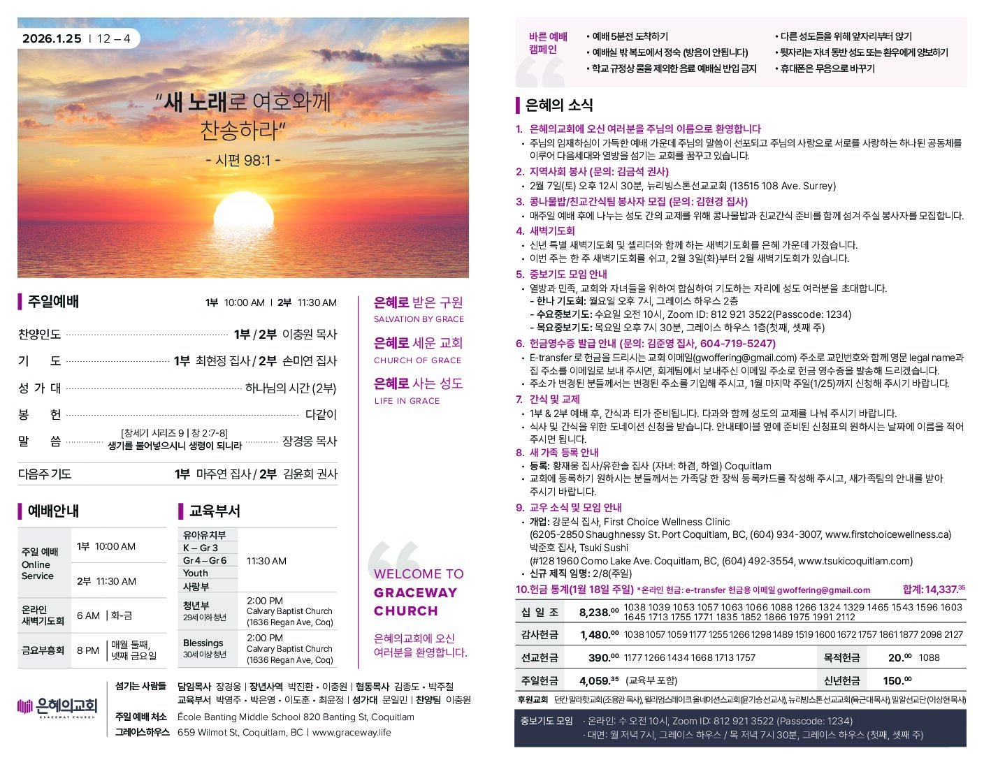 1. 은혜의교회에 오신 여러분을 주님의 이름으로 환영합니다 주님의 임재하심이 가득한 예배 가운데 주님의 말씀이 선포되고 주님의 사랑으로 서로를 사랑하는 하나된 공동체를 이루어 다음세대와 열방을 섬기는 교회를 꿈꾸고 있습니다. 2. 신년기도카드 (헌금함에 넣어 주시면 됩니다) 2026년 기도카드에 새해를 맞이하며 마음에 품고 기도하시는 기도제목을 적어 주시면 함께 기도하겠습니다.신년기도제목은 교회 홈페이지를 통해서도 제출하실...
